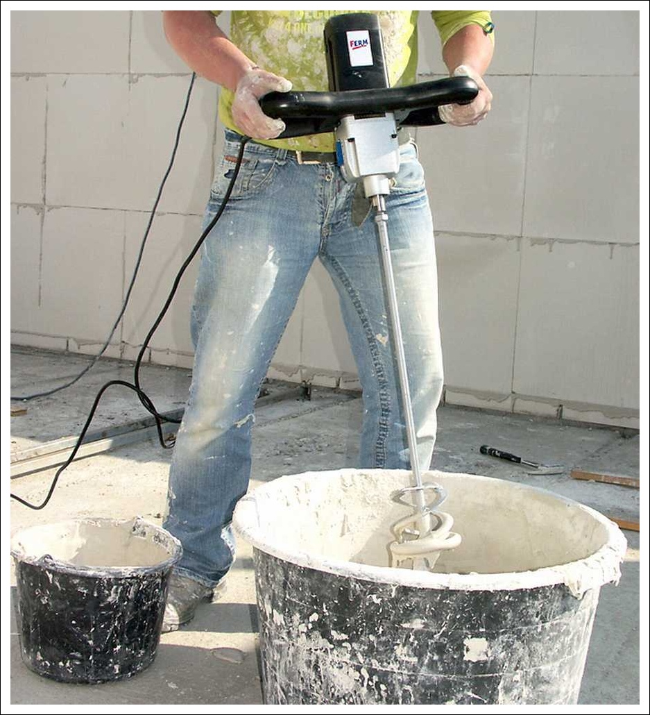 - Míchadlo je přenosné zařízení, která pohánění elektromotor o příkonu 700 až 1600 W. Tyto nástroje dosahují okolo sedmi set otáček za minutu, mají vysoký krouticí moment, snesou dlouhodobé zatěžování a dokonale promíchají i značně husté stavební hmoty. Motor i převody mají vodě i prachu odolný kryt. Míchadla fungují tak, že jednotlivé složky nasypeme do nádoby, zalijeme podle návodu vodou a rozmícháme vhodnou metlou, přičemž míchadlem pohybujeme, aby se směs dobře promíchala i při okrajích nádoby.