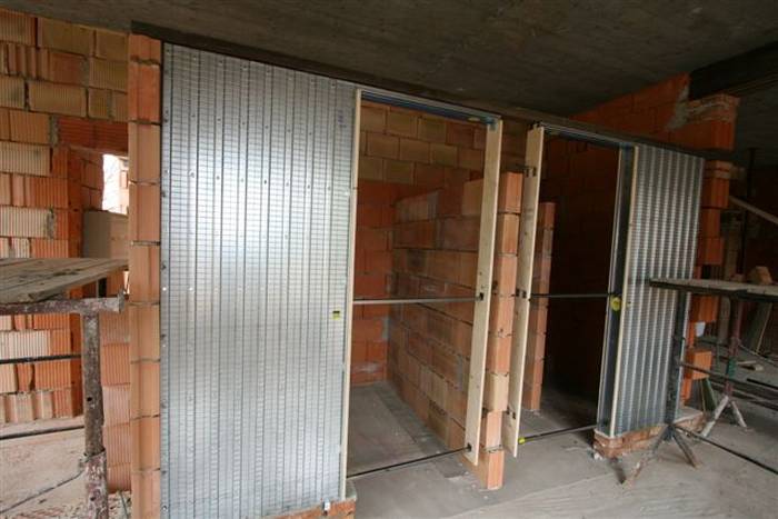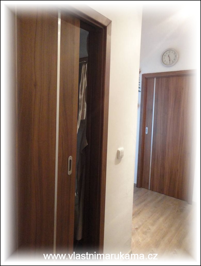 - Stavební pouzdro opláštíme sádrokartonovou deskou. Poté omítneme a nakonec i osadíme vybraným dveřním křídlem.
