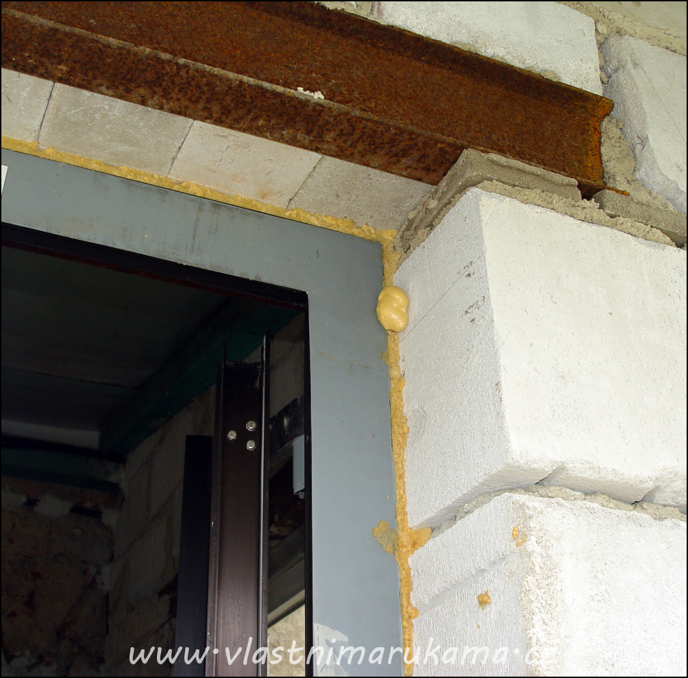 - Jako překlad pro nové dveře s hliníkovými rámy jsme usadili ve zdi železnou traverzu. K utěsnění a tepelné izolaci dveří použijeme montážní pěnu.