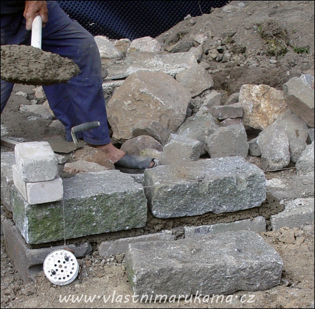 - Každou další řadu pokládáme od rohu, kámen uložíme do malty (vápenná malta s přídavkem cementu, aby pojivo mělo větší soudržnost).