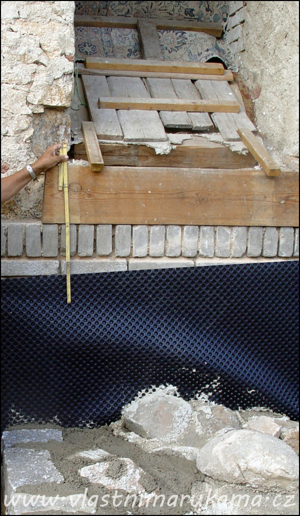 Základy pro schody připravujeme v průběhu stavby verandy, konečnou podobu získají až při interiérových úpravách dokončené stavby. Základ celého zádveří včetně prostoru pro schody izolujeme od staré stavby nopovou fólií. Po dostavbě základové desky vytvoříme z několika kamenů podklad pro schodiště, které bude z betonu. Nakonec schody obložíme dlažbou.