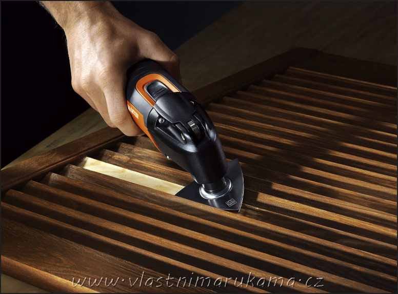 Třeba repas oken. S výjimkou toho, co je nutné udělat opalovací nebo horkovzdušnou pistolí ZDE, vystačí například multifunkční stroj. Patřičným nástavcem lze odřezat hřebíčky držící kovotěs. Zvětralé části rámu odstraníme zase rašplovým nástavcem až do zdravého dřeva. Šikovný stroj usnadní i pracné finální obrušování, protože s ním lze zajet až do rohů. Vybrušovat lze v různých profilech – mezi palubkami, u špalet oken a dokonce i různé dovnitř i ven vypouklé kousky. Dalším velmi praktickým nástavcem čistě odstraníme starý sklenářský kyt, což je jinak práce piplavě protivná a snadno při ní zajedeme hlouběji, než bychom chtěli a někdy nám sklo může prasknout. Místa na rámu, která drhla, sotva milimetrová, lze dalším nástavcem odstranit snáze, než hoblíkem. A třeba i přeleštit zavírací olivy… O tom, jak je natřít ZDE.