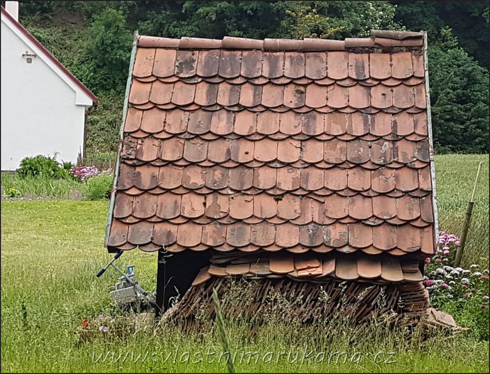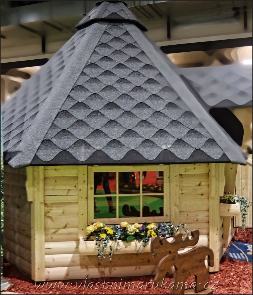 Strop uděláme tak, že přišroubujeme střešní bednění. Vytvoříme vrchol štítu a základ konstrukce střechy. Propojíme stěny a střechu úhelníky. Střecha by měla být postavena tak, aby byla pevná a chránila dětský domek před vodou a sněhem. Izolujeme ji vhodnou střešní krytinou, například asfaltovým šindelem, které k latím krovu přitlučeme hřebíky.
