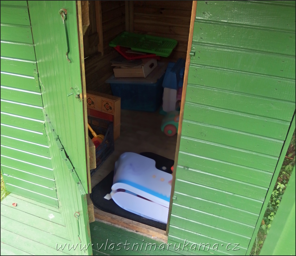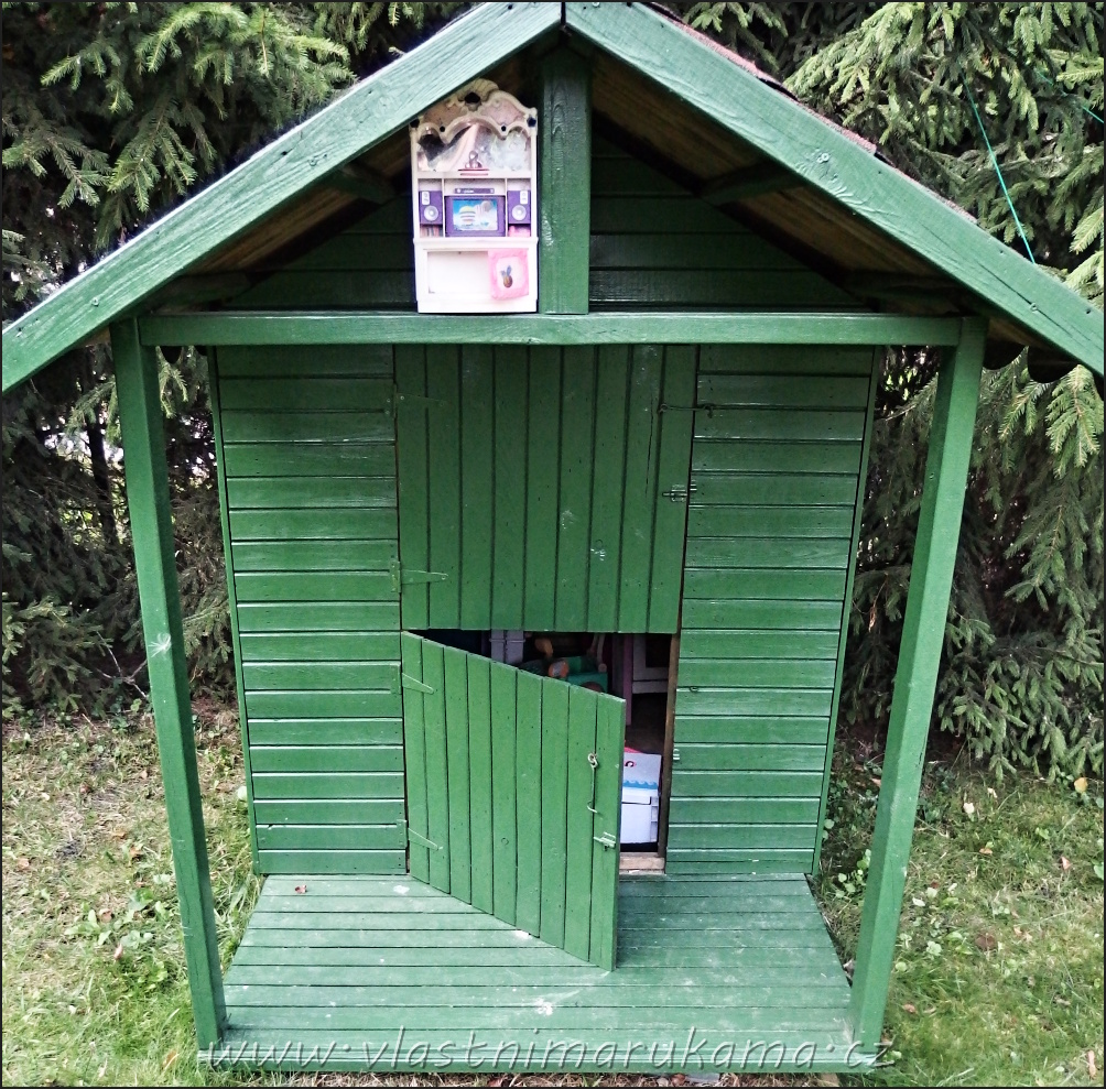 Zeleně natřený zahradní domek pro děti, před ním leží černý kocour